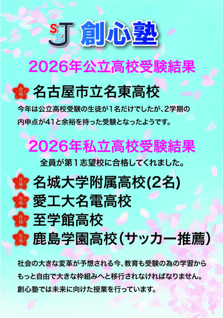 創心塾は名古屋の学習塾・進学塾です。名古屋の学校教育事情に精通したベテラン講師のみが指導致します。お気軽にご相談下さい。